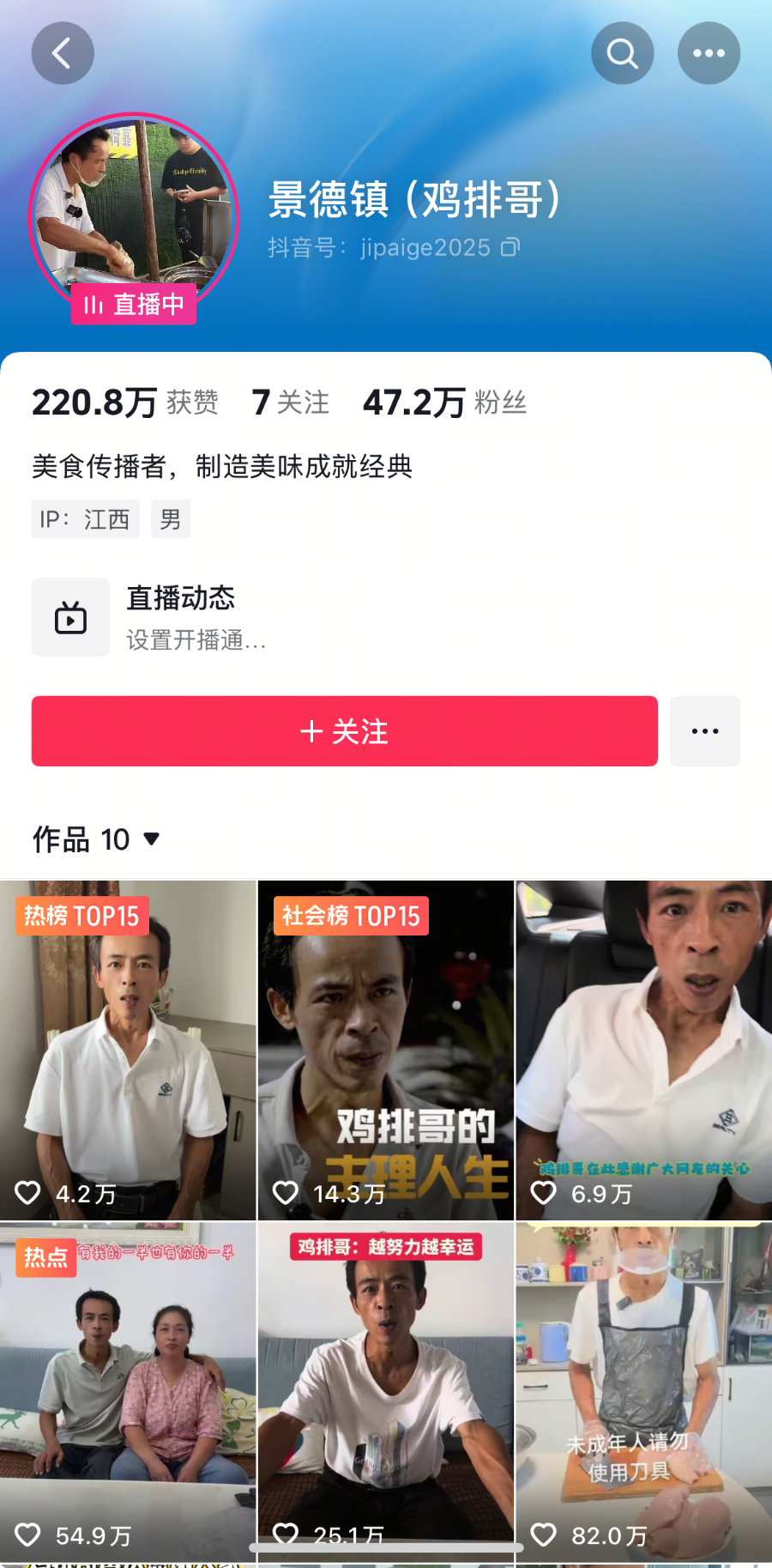 在线上,不少网友借用“鸡排哥”的语录进行“二创”,高强度工作心酸时刻和“鸡排哥”的激情语录搭配,掀起一波模仿潮。鸡排哥9月23日在抖音开设了个人账号“景德镇(鸡排哥)”,截至9月30日下午,七天时间内粉丝数狂飙至220.8万,单条最高点赞达到82万。