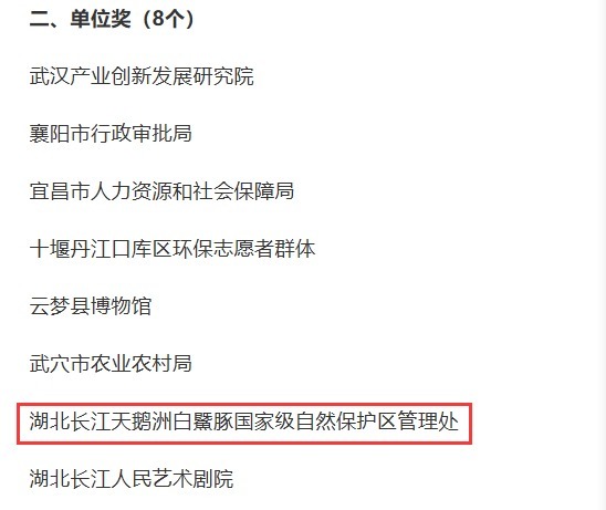 湖北日报客户端讯(通讯员郝继华)近日,第五届湖北改革奖表彰决定公布,湖北长江天鹅洲白鱀豚国家级自然保护区管理处凭借在生态保护领域的体制机制创新与实践成效,成功斩获“第五届湖北改革奖(单位奖)”,成为全省生态保护系统中首家获此殊荣的先进单位。
