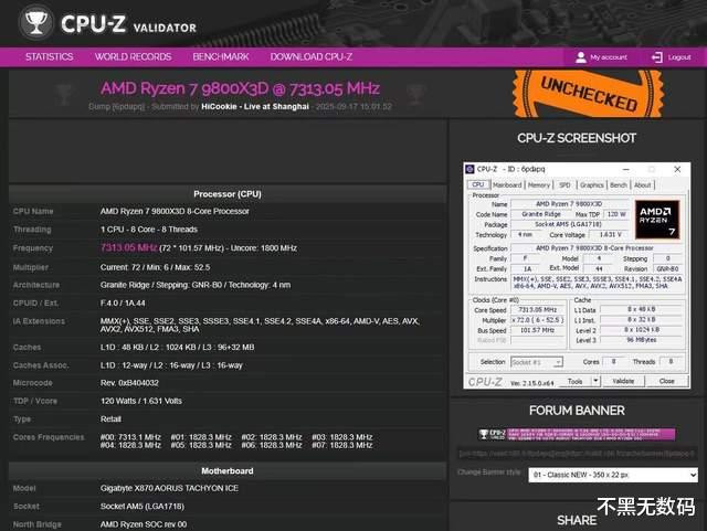 9 月 17 日股票配资论坛是什么,科技圈目光聚焦于技嘉 2025 新品发布会,这场盛会以 “硬核科技,极致体验” 为主题,不仅圆满落幕,更在超频领域掀起震撼波澜 —— 全球知名超频大师、多项世界纪录保持者 HiCookie,凭借技嘉 X870 AORUS TACHYON ICE 钛冰雕主板与 9800X3D 处理器的超强组合,成功将 CPU 超频至7.3GHz,不仅通过了权威的 CPU-Z 认证,更一举打破此前的全球超频纪录,为这场新品发布会画上了浓墨重彩的 “性能巅峰” 一笔。